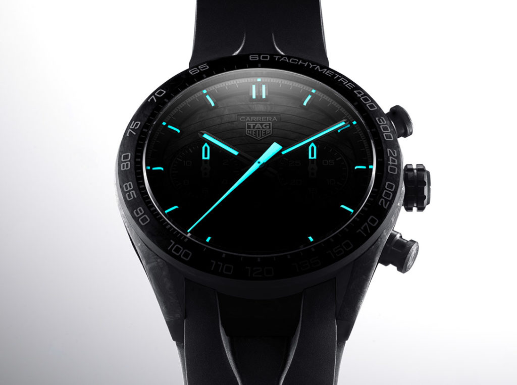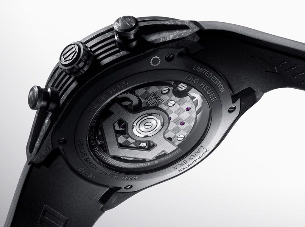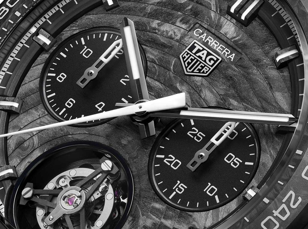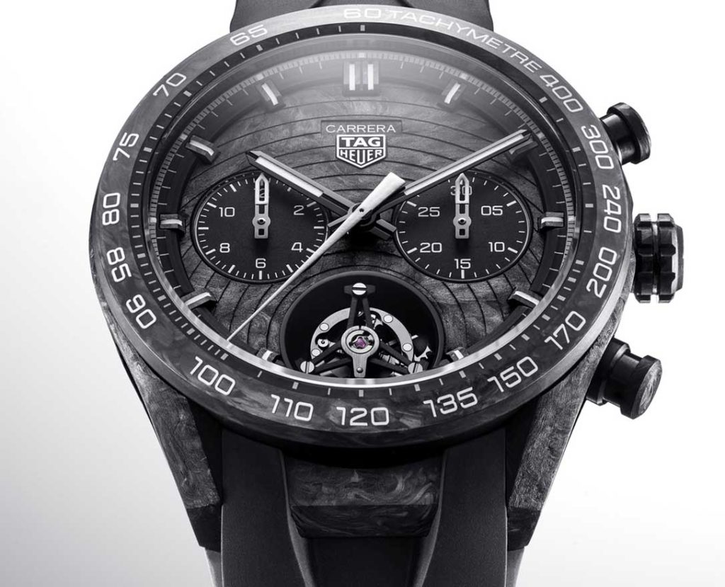 Like the Monaco Flyback Chronograph, the new Carrera Chrono Tourbillon Extreme TH-Carbonspring incorporates TAG Heuer‘s latest cutting-edge breakthrough in its TH20-61 caliber, a state-of-the-art oscillator presented as “ultra-light, shock-resistant, and anti-magnetic”. What’s more, its presence ensures high-performance timekeeping even in the toughest conditions. These results were acknowledged by the COSC which awarded its certificate to the watch’s selfwinding movement. This outstanding device, which delivers a power reserve of 65 hours, comes equipped with a 1-minute tourbillon and drives the hour and minute hand rotations. It also lets the wearer measure short-cycle time to a ¼ of a second.