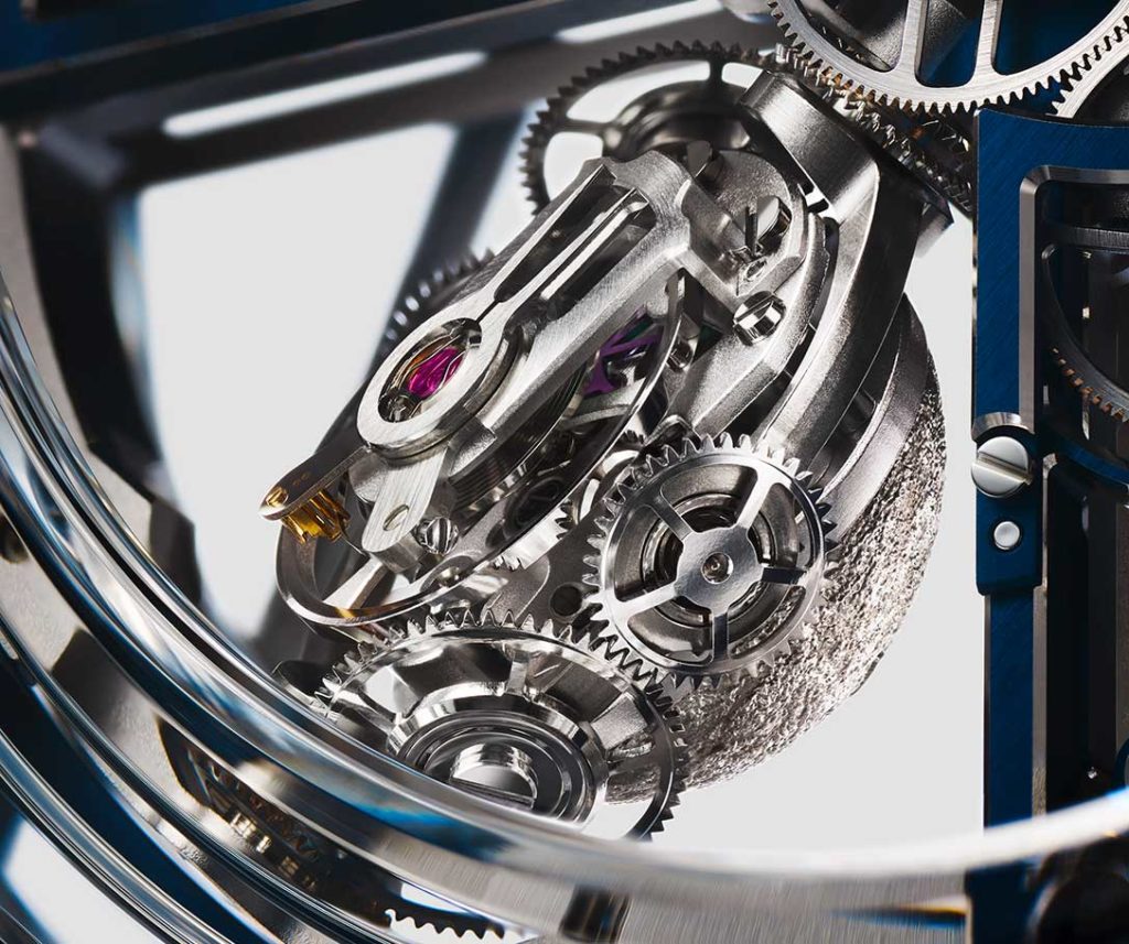 The existence of nine ceramic ball bearings makes it insensitive to magnetic fields and doesn’t require any lubrication. The module, comprising 139 components, comes in a reduced size of 1.3 cm3 (13.4 x 10.9 x 8.84 mm), 30% less than the original device. It nestles at 6 o’clock in the 46 mm-diameter blue or translucent sapphire-crystal case and takes up very little space in the semi-openworked scenography. The hours and minutes are displayed on a lapis lazuli dial. A small seconds and a power reserve indicator (50 hours) completes the composition without weighing it down. The transparent back invites to discover the one-of-a-kind architecture and inner workings of high-frequency Caliber 8812S (36,000 vibrations an hour). What’s more, it bids to admire the Gravity Control in all its glory.