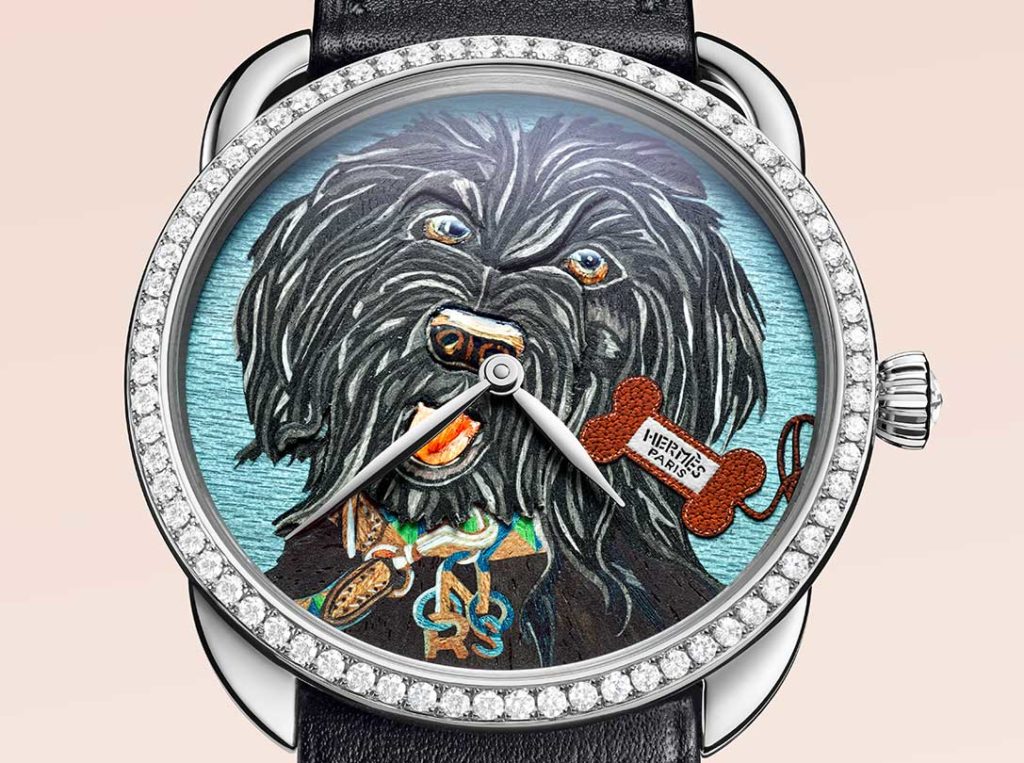 Une fois encore, le boîtier rond avec ses attaches asymétriques, imaginé par Henri d’Origny en 1978, sert d’écrin à des créations originales, les Arceau Jour de Casting signés Hermès. Outre l’or blanc qui les compose, leur diamètre de 38 mm et leur lunette sertie de 71 diamants, toutes ont pour point commun de posséder un cadran inspiré du carré de soie éponyme dessiné par la plasticienne australienne Liz Stirling. La première, une édition limitée à 12 exemplaires et dénommée Orson, présente ainsi l’effigie d’un chien au pelage noir et blanc réalisé en marqueterie de bois et de cuir. Huit essences distinctes ont été utilisées pour finaliser ce portrait facétieux.