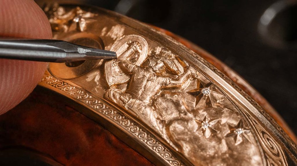 « La série La Quête rend hommage à l’observation astronomique, à l’origine même de la mesure du temps. Elle s’inspire également des grandes épopées mythologiques et légendaires… » détaille Christian Selmoni. Parmi les créations, la pièce unique Les Cabinotiers Tourbilon Armillaire – Le Mythe des Pléiades fascine par la mise en scène des informations temporelles, son haut degré de finitions et son calibre d’exception. Aussi, son boîtier de 45 mm de diamètre usiné en or rose et serti de dix diamants taille brillant est rehaussé par une sublime gravure finalisée après un travail minutieux de 450 heures, une représentation mythologique d’Orion à l’assaut des Pléiades, les sept sœurs transformées en étoiles.