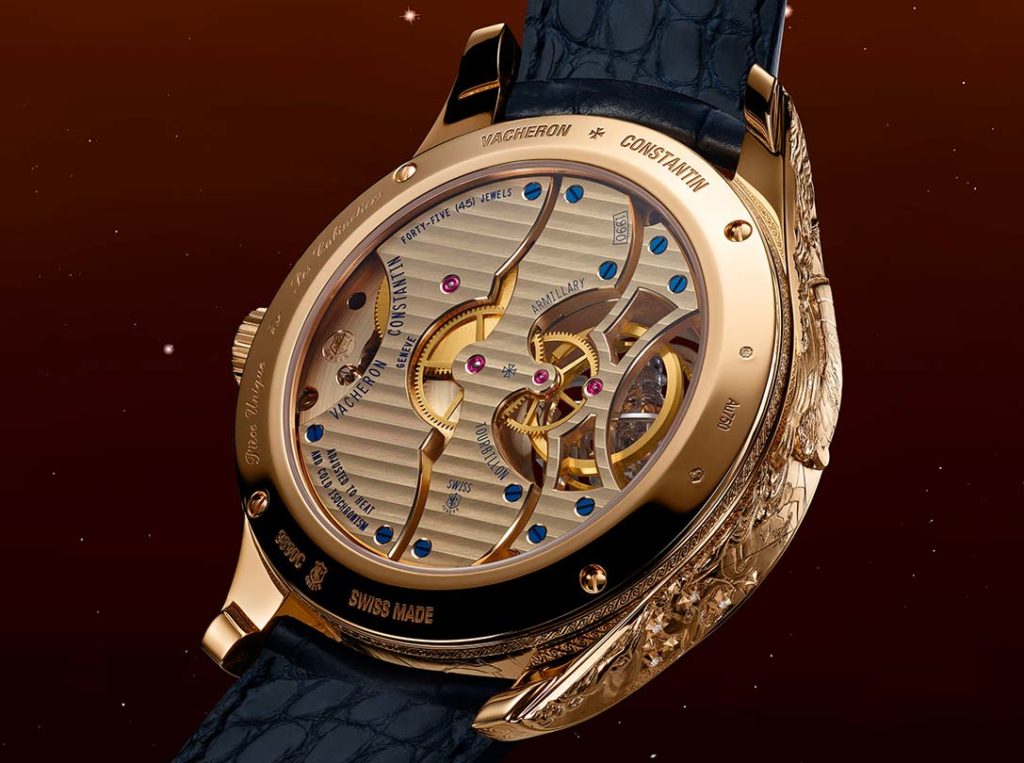 « Cette montre se distingue par son tourbillon armillaire, un système de régulation à deux axes de rotation directement inspiré des développements réalisés pour la montre Référence 57260, présentée en 2015 avec 57 complications… La dénomination « armillaire » évoque une représentation en mouvement des corps célestes telle qu’on les observe depuis la Terre » précise le Directeur du style et du patrimoine de Vacheron Constantin. Le calibre 1990 orchestre les girations de l’organe réglant, doté d’un battement concentrique qui trouve son origine dans la présence d’un spiral en titane dépourvu de courbe terminale. Le mouvement à remontage manuel délivre environ 60 heures de réserve de marche, période durant laquelle il dispose assez d’énergie pour propulser avec rigueur le système rétrograde instantané des aiguilles des heures et des minutes.