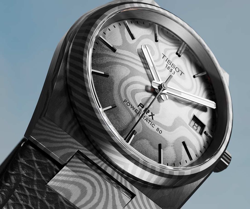 La référence PRX Powermatic 80 Titane adopte, sur son boîtier et son bracelet à maillons, ce métal à la robe gris soutenu, réputé pour sa solidité et sa légèreté, qu’elle associe à un visage parcouru d’un damier teinté marine ou anthracite survolés d’aiguilles de type bâton, luminescentes, argentées ou dorées. Quant au modèle PRX Powermatic 80 Damas, il est usiné en acier Damas, un alliage plus robuste que celui traditionnellement utilisé en horlogerie, dont la surface est parcouru de volutes. Ces arabesques formées naturellement figurent également sur le cadran, faisant ainsi naître une cohérence visuelle sur l’ensemble de la montre.