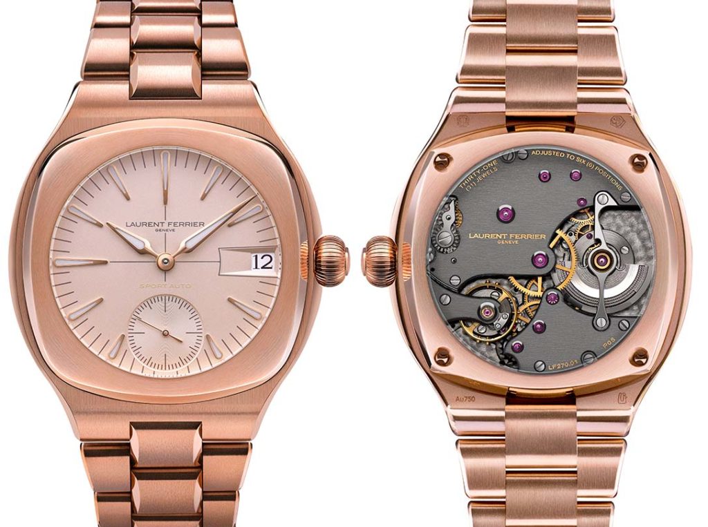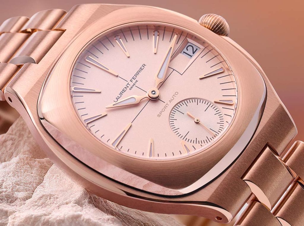 Fidèle à la griffe épurée de Laurent Ferrier, ce garde-temps présente un boîtier de forme coussin en or rouge 5N de 41.5mm de diamètre pour 12.70mm d’épaisseur. Ce dernier est coiffé d’une lunette carrée aux angles adoucies et ponctué d’une couronne de type boule cannelée. Il abrite un mouvement maison, le calibre LF 270.01 à remontage automatique qui bat à la fréquence standard de 28’800 alternances par heure, intègre un micro-rotor en platine et délivre une réserve d’énergie de trois jours. Le cadran associe une teinte blanc cassé à un traitement galvanique à la fois argenté et rosé et une finition opaline, un ensemble délicat qui se marie merveilleusement bien à la chaleureuse caresse de l’or rouge du boîtier et du bracelet à maillons. Le temps y est inscrit grâce aux aiguilles de style sagaie enduites de Super-LumiNova® blanc pointant une nuée d’index gouttes et une minuterie poudrée grise tandis que les secondes défilent dans un compteur azuré à 6h et la date apparaît dans une fenêtre à 3h.