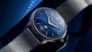 S’offrant à la vue telles les ailes d’un papillon déployées vers le soleil, deux guichets superposés, reliés par un indicateur en forme de losange et ouverts en éventail, culminent à 12h sur la carapace subtilement miroitante qui recouvre le cadran. Dans la partie supérieure, la fenêtre la plus large, se trouve l’heure tandis que les minutes sont installées dans la partie inférieure. Inscrites en bleu, elles sont traînantes, ce qui accentue l’esprit poétique de cette montre.