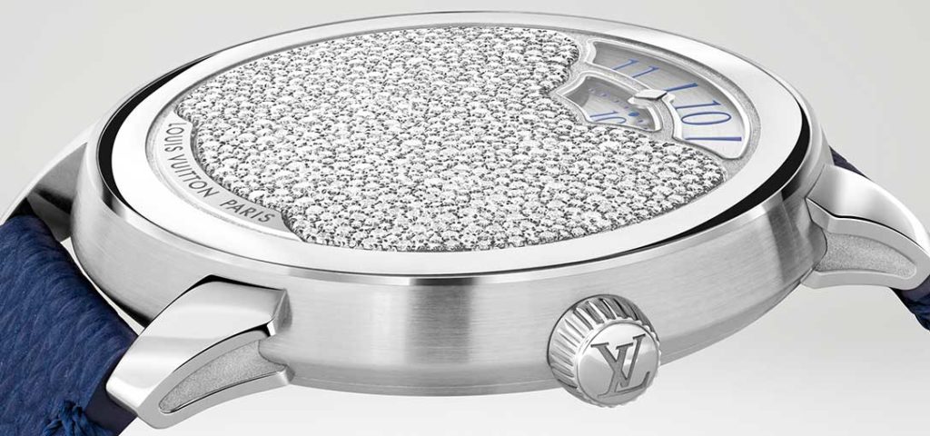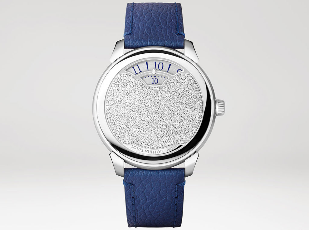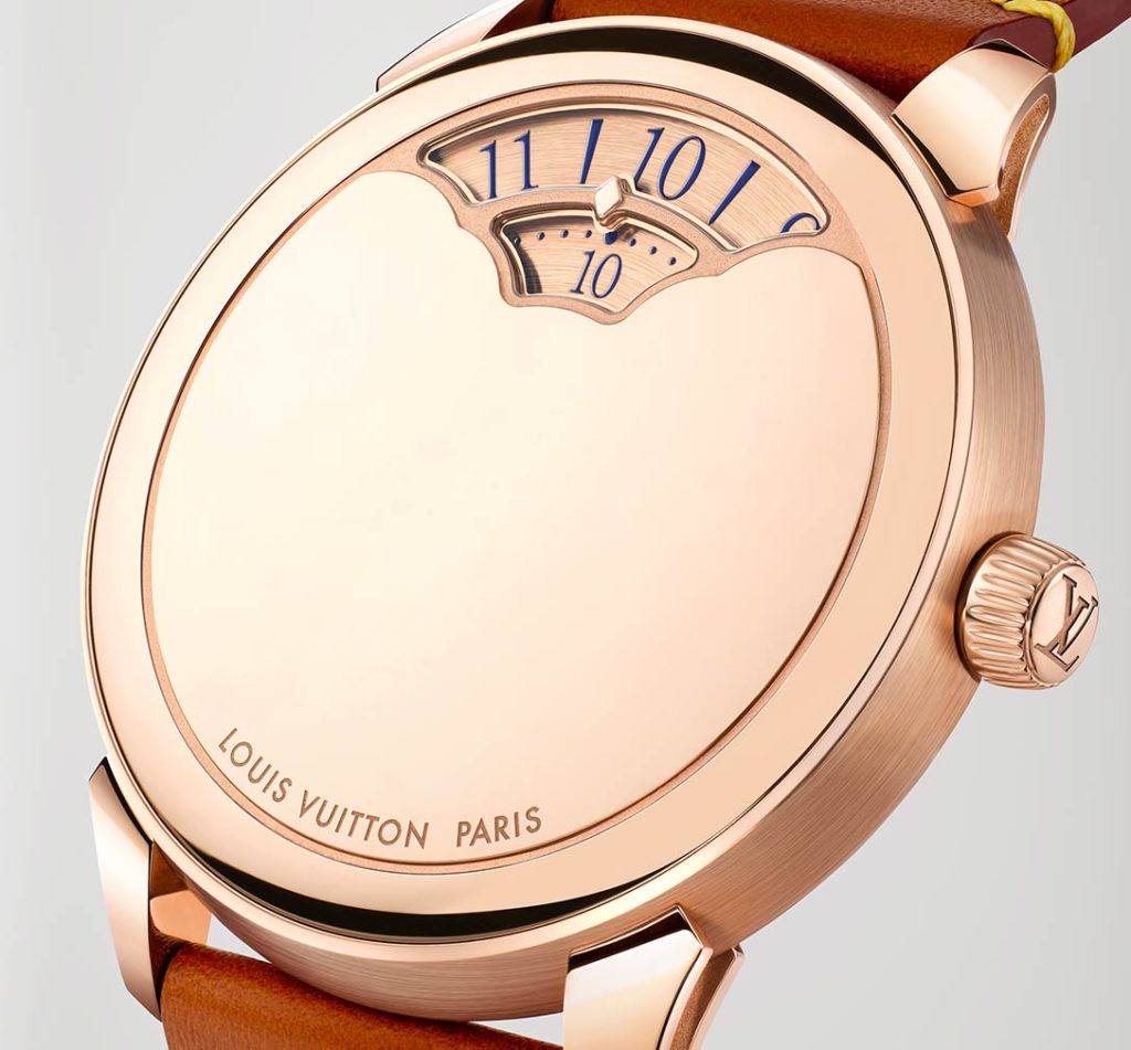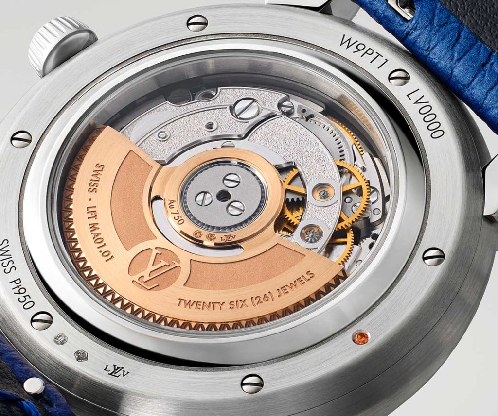 La ronde tranquille des disques délicatement dorés ou rhodiés de ces affichages prend vie au rythme du calibre LFT MA01.01, un mouvement automatique 4hz manufacturé par La Fabrique du Temps Louis Vuitton. Une fois pleinement remonté grâce au ballet de sa masse oscillante, il délivre une réserve d’énergie atteignant les 45 heures. Ce moteur aux finitions parfaites loge au sein d’un boîtier de 37mm de diamètre et 8mm d’épaisseur, muni d’une couronne cannelée, auquel sont arrimés deux brins de cuir de veau teinté auburn ou marine.