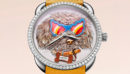 The 42 mm grade 5 titanium case still flaunts its special architecture with its four distinct spaces. One displays the hours and minutes. The next one, the power reserve (96 hours). The third stages a rare feature, a thermometer that can measure temperatures from -20°C to +60°C. The last one is decorated with a badge engraved with the firm’s iconic battle axe. A single tap is all it takes to open this module to access the element that plays the role of crown. By turning it ten times, the caliber fills up on energy. The HM11 Art Deco is available in two limited editions, one boasting a blue mainplate, 3N yellow gold bridges, and a white lizard strap, the other combining a green hue with 5N rose gold and a beige reptile leather wraparound.
