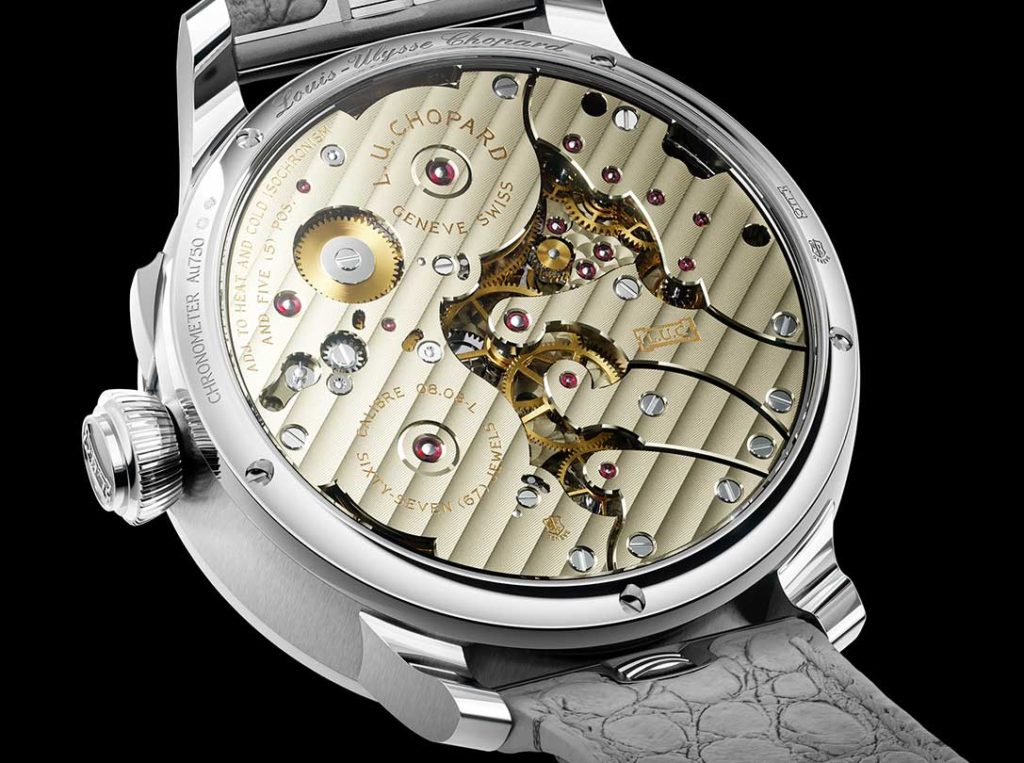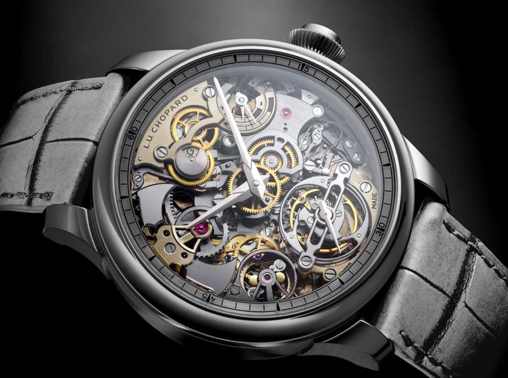 Some elements stand out, in particular a 1-minute tourbillon set at 6 o’clock, two hammers at 10, and a power reserve indicator at 2. Energy management is crucial here to drive the minute repeater, as well as a grande sonnerie and a petite sonnerie, complications that are energy-intensive. The first chimes the hours, quarters, and minutes on demand; the second, the hours and quarters automatically, whilst the last only sounds out the quarters. A discreet selector nestling next to the crown lets the wearer choose their favorite melody. The watch relies on two barrels – one for the time indication with a 70-hour power reserve and one for the strike work mechanism, which provides up to 12 hours’ autonomy in grande sonnerie mode. “Upon each manual (…) or automatic (…) activation of the chime, 34 components leap to attention, poised to deliver a clear and precise report of the time. Guided or retained by an array of 22 hand-adjusted blade springs, these 34 components require only 0.03 seconds to go from standby to being ready for action…”, details Chopard. Fine watchmaking never ceases to amaze us.