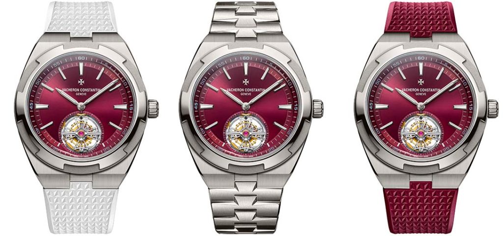 The dial dresses up in a deep, classy burgundy red. This face with its dazzling hue, set off with a sunburst satin-brushed finish, is a magnificent backdrop for the tourbillon, featuring a small seconds, and totally hand-beveled. This element of the selfwinding movement assembled using some 188 components whirls round meticulously over the course of the 80-hour power reserve. During this period, the timepiece wearer can complement their Overseas with an integrated bracelet flaunting titanium links or, if they wish to go for a somewhat more sporty look, with a white or red rubber alternative.