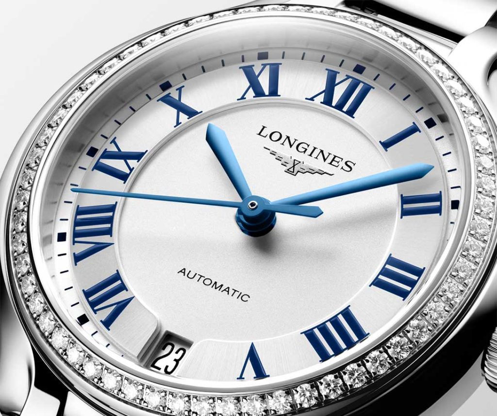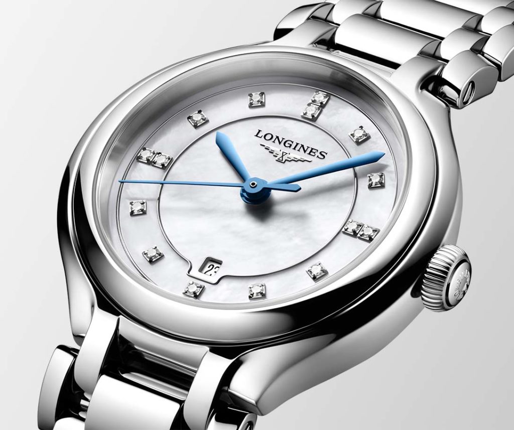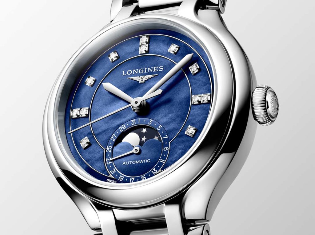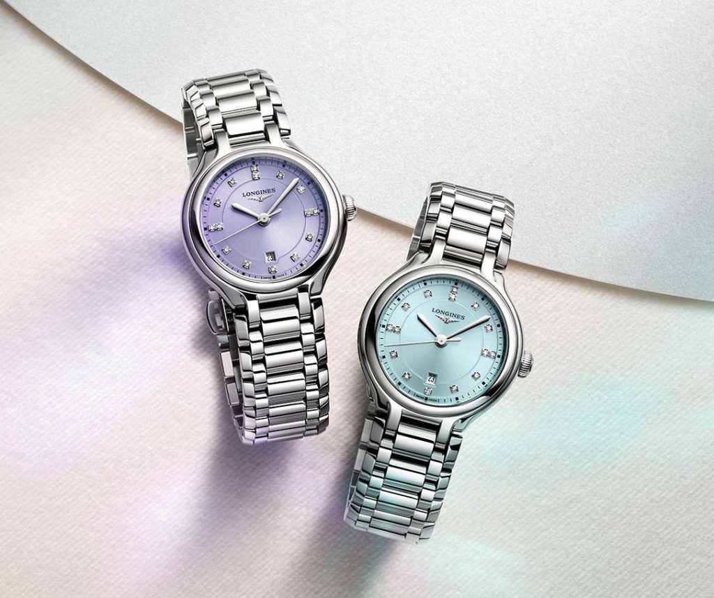 The winged-hourglass brand enhances the range with variations embracing a 30 mm-diameter, 8.30 mm-high case, which hosts a quartz L257.2 caliber. This movement energizes the hour and minute hands, the direct-drive, and the date display at 6 o’clock for three years. An EOL (End of Life) system informs the watch wearer when the battery is almost done. These pieces are dressed with sunburst mint-blue and lavender finishes, set off with 15 Top Wesselton VS-SI diamonds, totaling some 0.057 carats. In short, these PrimaLuna make their mark as a can’t-do-without accessory in stylish women’s wardrobes.