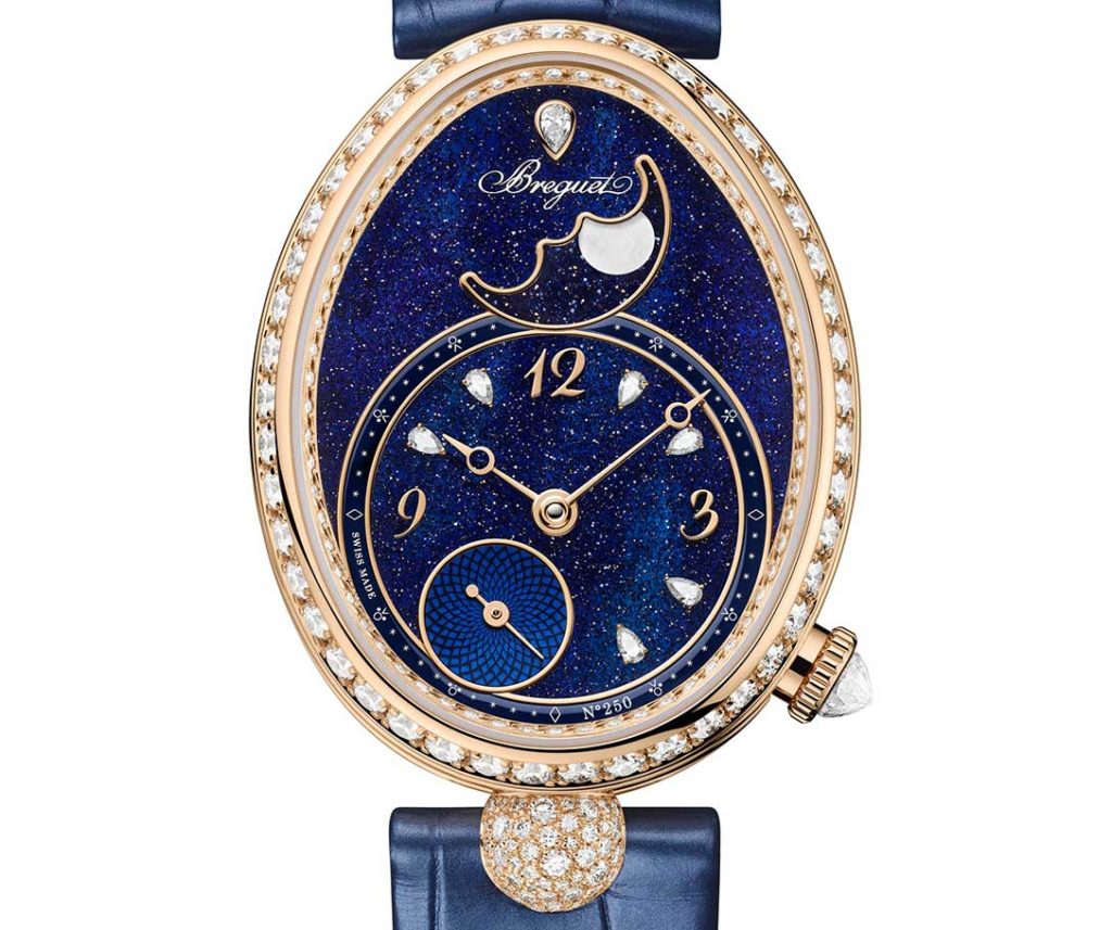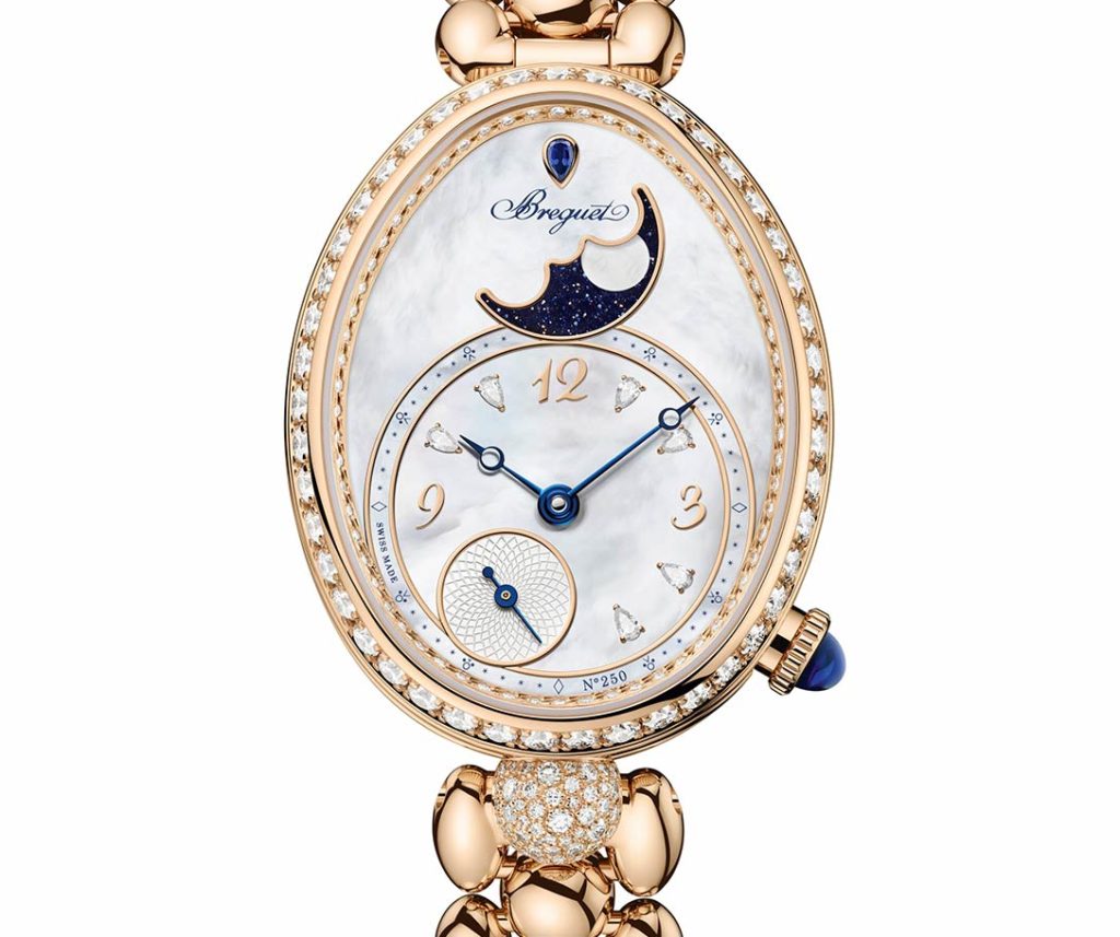 Available in four versions, the first model features a 36.5 x 28.5 mm oval Breguet gold case set with 109 diamonds and a fluted middle case measuring 10.3 mm in height. It houses the caliber 537L2, a movement vibrating at a frequency of 3.5 Hz, which is wound by its guilloché “Petit Trianon” platinum oscillating weight. The dial combines the iridescent reflections of Tahitian mother-of-pearl with the translucent depth of midnight blue aventurine glass to display the hours and minutes, slightly off-center at 6 o’clock, the small seconds chiseled with the “Quai de l’Horloge” patterne, and the moon phase placed in the upper part dominated by a pear-cut diamond. The second reference combines three versions and is only available with a flexible bracelet made of pearl-shaped links. Punctuated by a gem-encrusted ball at 6 o’clock, the Breguet gold case set with 107 brilliant-cut diamonds houses the caliber 586/1, which drives the Breguet hands with hollowed-out tips for the hours and minutes on a white mother-of-pearl, Breguet gold, or black lacquer and aventurine glass disc surrounded by a band of precious stones.