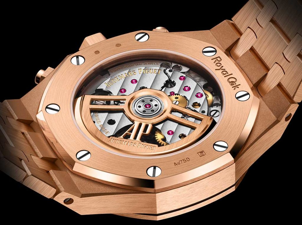 After the Code 11.59, Audemars Piguet is now enhancing its collections with novel Royal Oak Chronograph pieces boasting 38 mm-diameter cases. For these timepieces, the manufacture placed the focus on a brand new caliber, the 6401 that beats at 4 Hz and supersedes the 2385 (3 Hz) launched some 30 years ago. An architectural upgrade resulted in a more compact construction (27 x 5.7 mm) despite the large amount of components within, 348. Three initial references today enjoy the performances and characteristics of the selfwinding movement (55-hour power reserve). All come with a sapphire-crystal back that invites to discover the stylized oscillating weight, among other things.