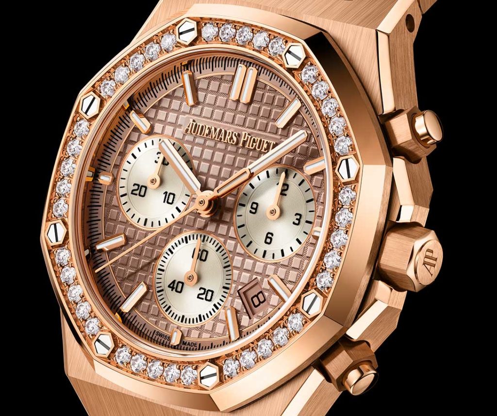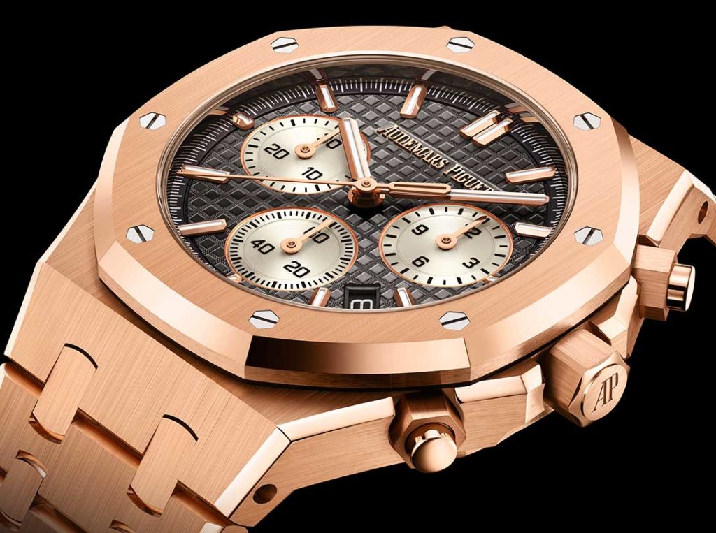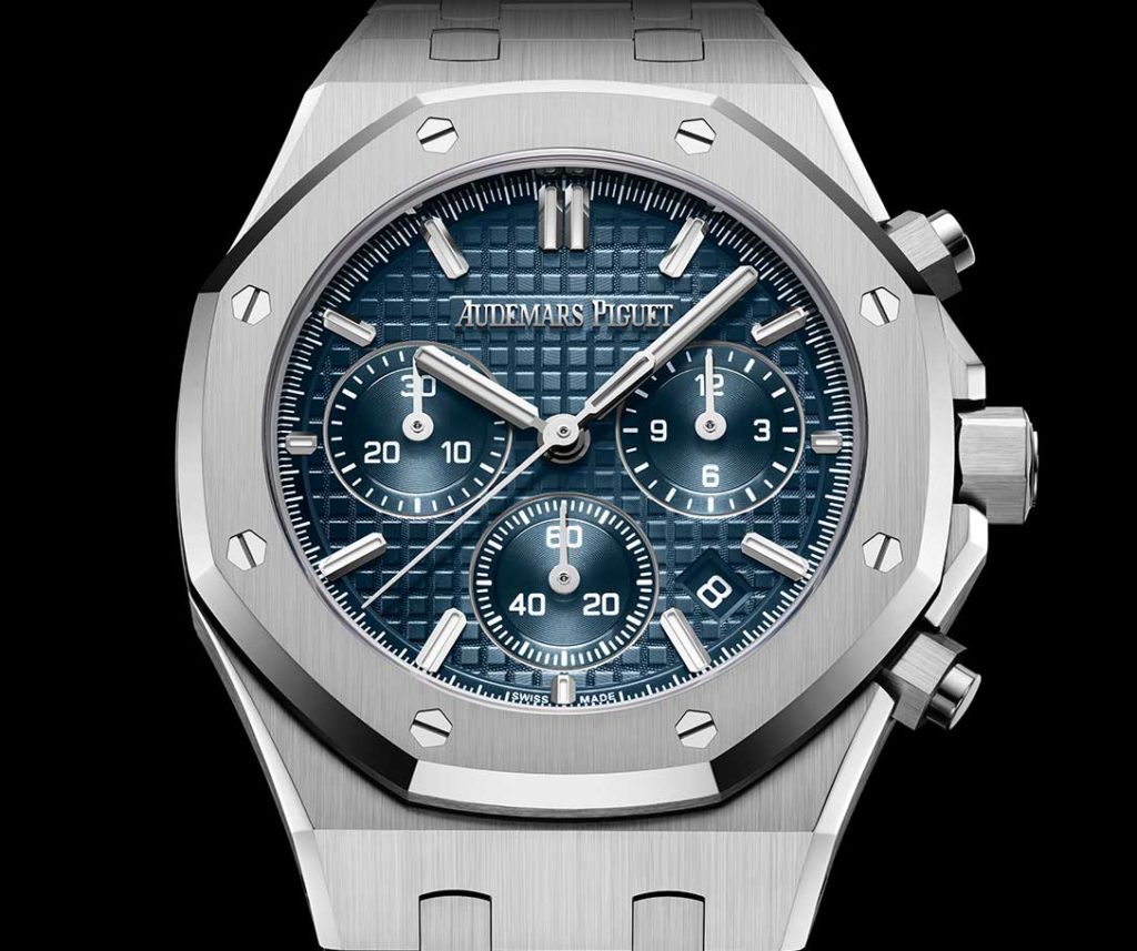 This trio hosts the signature Grande Tapisserie pattern on their dials, rolled out in midnight blue, dark gray, and Sand Gold. Here, the ever-so easy-to-read time-data scenography reigns with its chronograph and small-seconds counters, along with an hour chapter made up of Super-LumiNova®-topped markers. The date aperture sites at 4:30, like on its 41 mm elder siblings. These Royal Oak Chronograph iterations are available in steel or in 18-karat rose gold, completed by their integrated bracelet, crafted with links made from the same material. One variation stands out through its wonderfully-precious personality as its bezel’s strewn with 40 diamonds. No matter the style options Audemars Piguet offers, all these upgrades ensure the chic & sporty look is increasingly versatile.