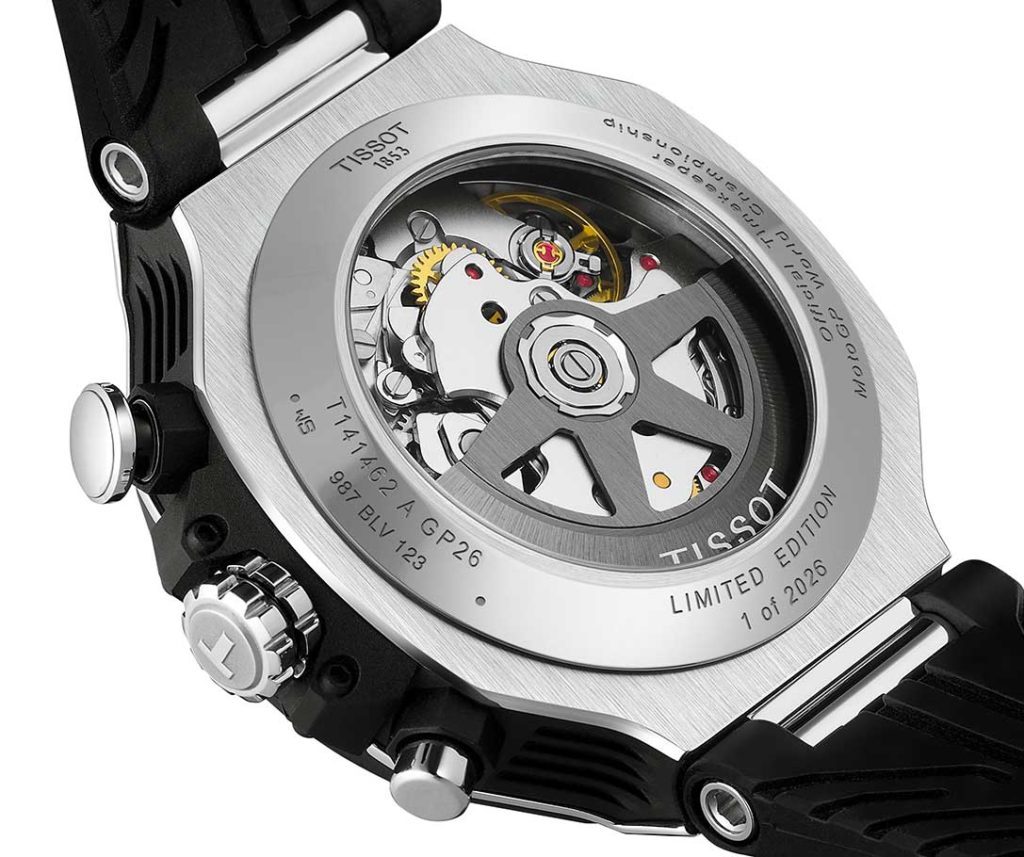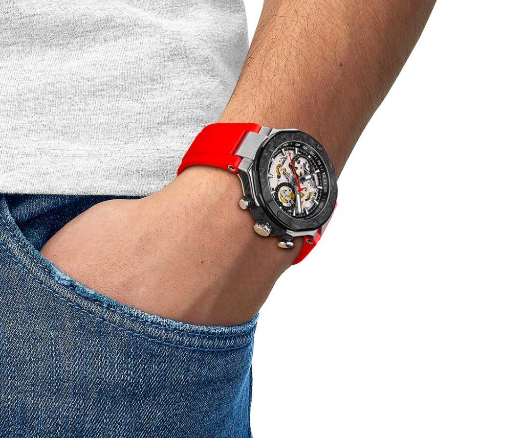 This model isn’t just a simple upgrade as it stands out with its new caliber, the skeletonized Valjoux A05.951, unveiled through the openworked dial and sapphire-crystal back of the 45 mm-diameter, 14.79 mm-thick case. What’s more, many of the selfwinding movement components enhance the watch’s sporty look. A look that’s magnified even more thanks to the black PVD bezel with its carbon composite insert. And, to reach a comfortable power reserve of 68 hours, energy distribution has been optimized. “The rotor movement is facilitated by a ball bearing mechanism that guarantees smooth, uninterrupted operation, while reducing friction and wear”, states Tissot. Its NivachronTM balance spring also makes the caliber insensitive to magnetic fields. A shock-absorption system, the Nivachoc A, protects the watch’s functioning, even under challenging conditions. Ready for a rush of adrenaline?